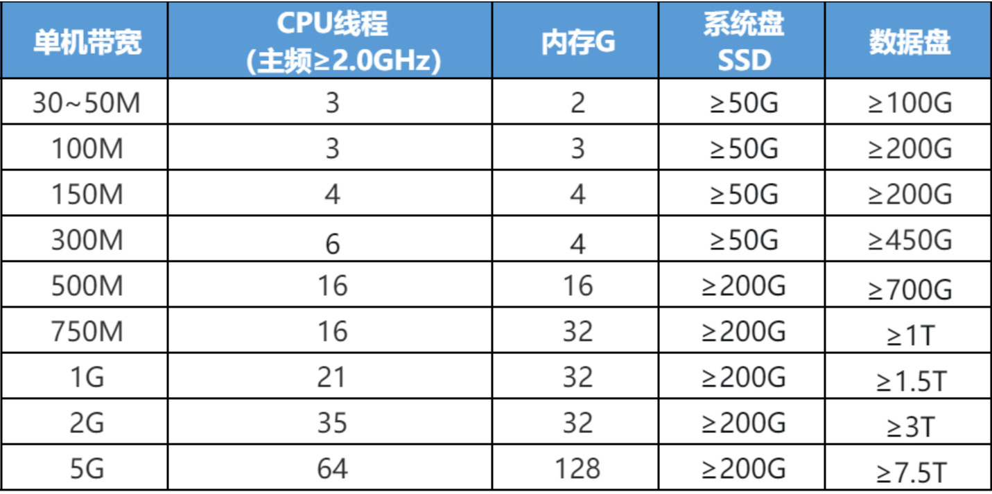 【线路】单线≥30M,单机≥100M;下行带宽需≥上行的80%,单机总线路数≤100条